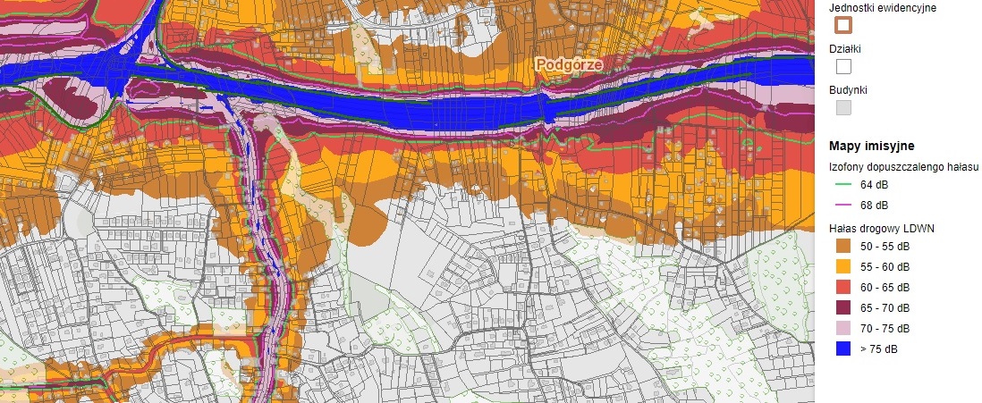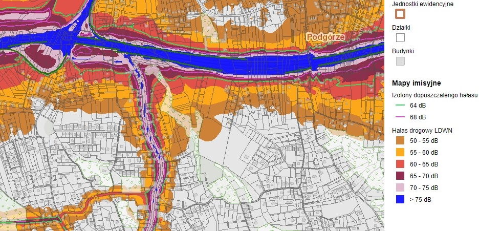 1) Zasadniczym źródłem informacji o skali zagrożenia hałasem na terenie miasta oraz podstawowym narzędziem do sporządzenia Programu ochrony środowiska przed hałasem są mapy akustyczne. Ostatnia taka mapa dla miasta Krakowa opracowana została w 2017 roku i dostępna jest m.in. na stronach portalu Miejskiego Systemu Informacji Przestrzennej [1]. Na mapie tej (Rys. 1) zaznaczono hałas drogowy za pomocą wskaźnika LDWN (wskaźnik długookresowego hałasu dobowego) poprzez: kolor czerwony 60-65 dB, bordowy 65-70 dB, różowy 70-75 dB, a kolorem niebieskim zaznaczono obszary hałasu powyżej 75 dB. Już na pierwszy rzut oka widać posesje mieszkańców Swoszowic zaznaczone na czerwono czy ograniczone zielonymi izofonami dopuszczalnego hałasu powyżej 64 dB.